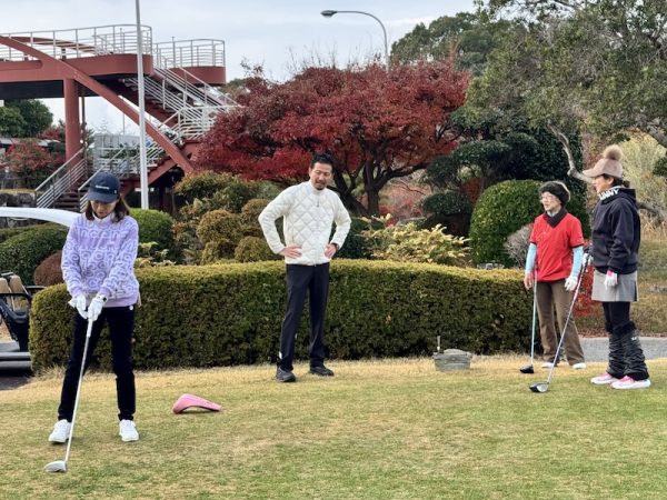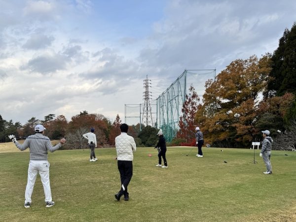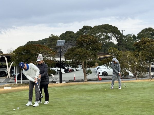 ラウンド前には練習場でドライバー、アプローチ、パターのレッスンを受けてからのスタート。